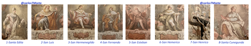 (1) Santa Edita de Inglaterra, hija del rey San Edgar ‘el pacífico’ y Santa Wulfrida; (2) San Luis, rey de Francia; (3) San Hermenegildo, rey de España (hijo de Leovigildo y hermano de Recaredo); (4) San Fernando, rey de España (Fernando III ‘el santo’); (5) San Esteban, príncipe de Hungría; (6) San Hemerico (hijo del anterior) príncipe de Hungría; (7) San Henrico (Enrique II de Alemania), Emperador; (8) Santa Cunegunda, emperatriz de Alemania (esposa del anterior).