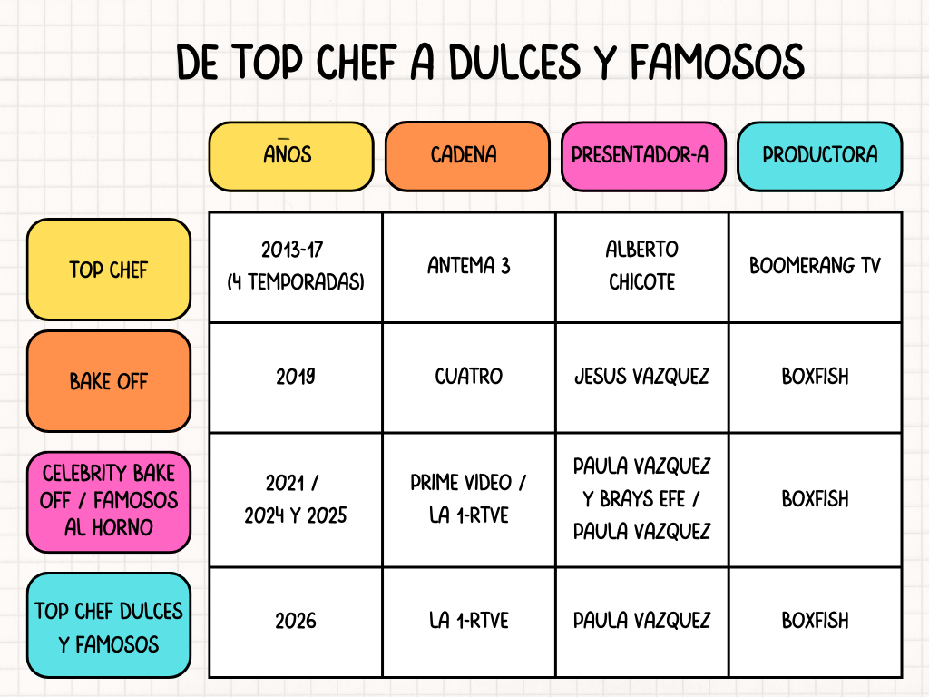 Lo primero que me sorprendió fue el nombre ¿Top Chef? Ese era uno de Chicote en Antena 3, ¿ahora lo presenta Paula Vázquez en La 1 o es que se trata de otro programa? Al ver el primero comprobé que, efectivamente, era otro programa, más parecido a Bake Off (o igual), supongo que le han cambiado el nombre por una cuestión de derechos. Sin embargo, al unir la marca con los contenidos de repostería, les ha quedado un programa que podríamos denominar ‘mutante’ y es que ha ido cambiando de cadena de emisión, de presentadores e incluso de productoras hasta llegar al momento actual con un resultado evolucionado y bastante óptimo.